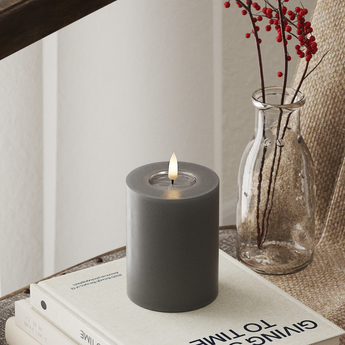 Тази елегантна LED блок светлина в Сиво Предлага ефект на „истински пламък“ в реалния живот, който е толкова жизнен, колкото истинска свещ. С височина 10 см и диаметър 7,5 см, всяка светлина на LED блок е внимателно изработена от свещи и смола, оборудвана с жизнен 3D пламък и уникално покритие от смола в горната част. Тази конкретна комбинация не само създава автентично усещане, но също така придава отличителния „мокър вид“, който имитира перфектно разтопени свещи.