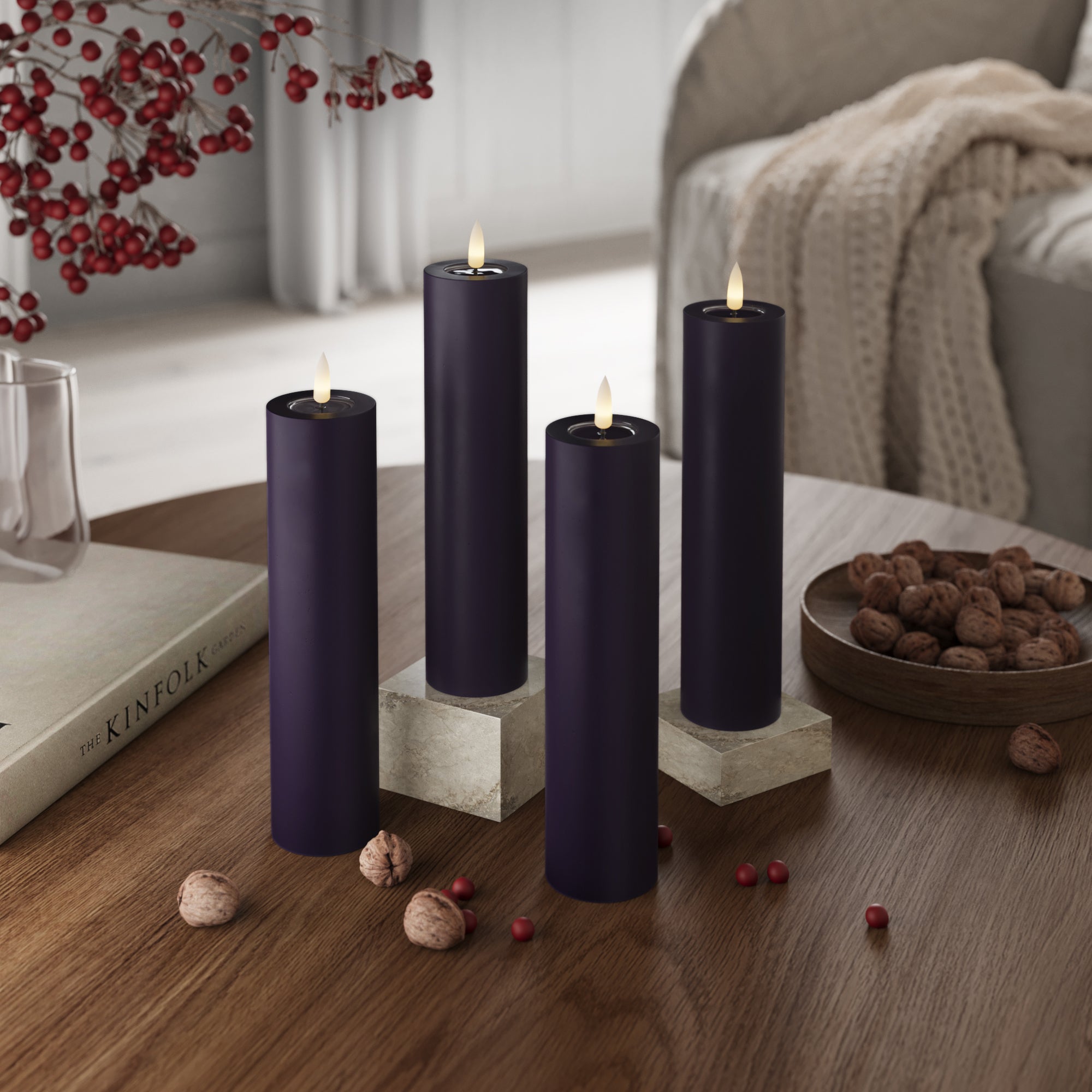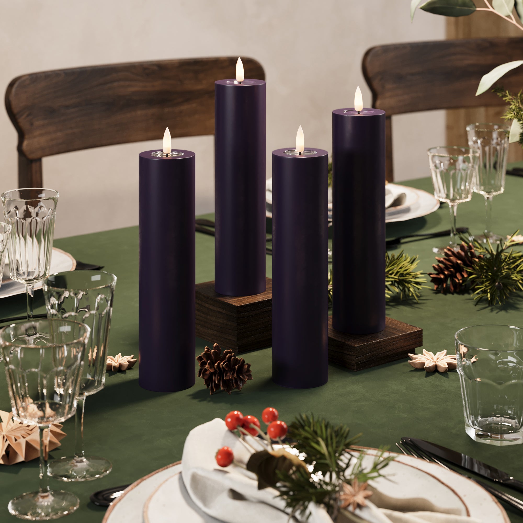 LED-Blockkerzen Ø 5 x 20 cm Dunkellila – 4 Stück