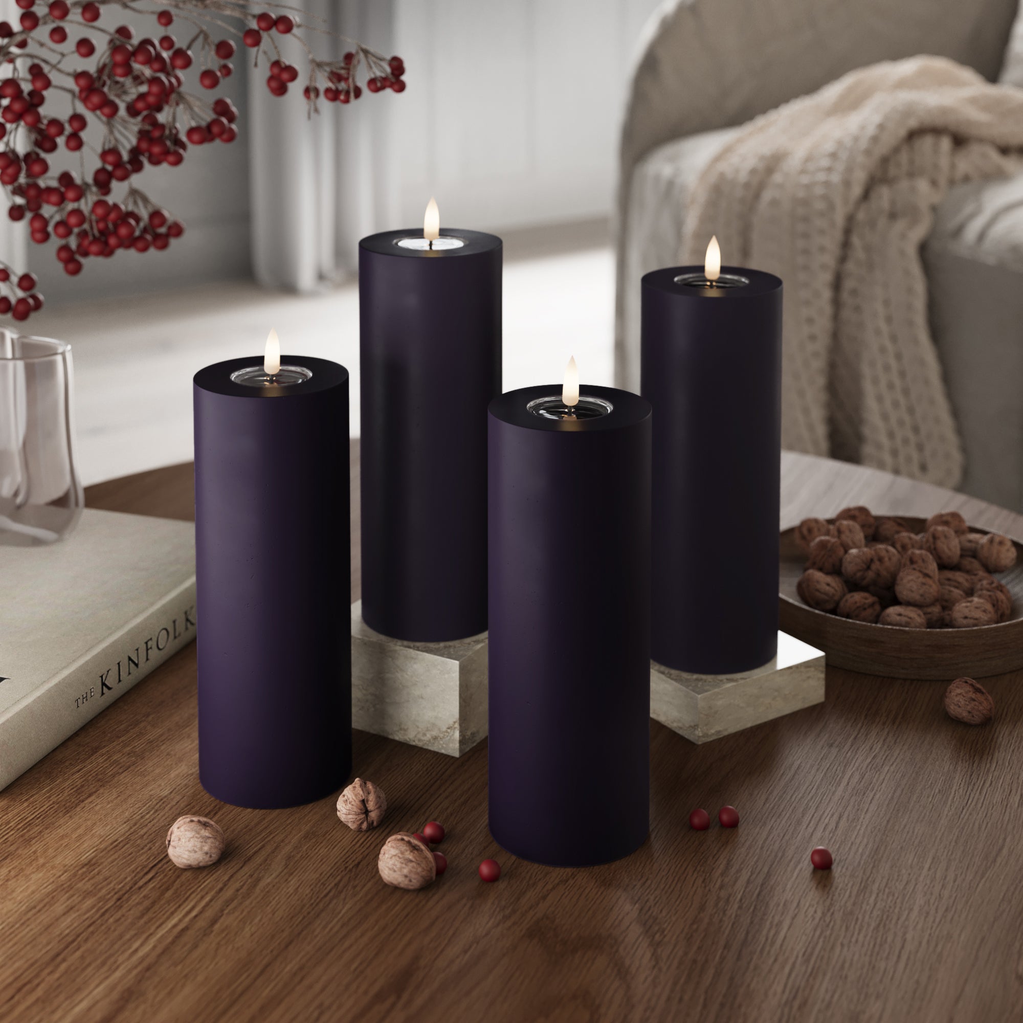 LED-Blockkerzen Ø 7,5 x 20 cm Dunkellila – 4 Stück