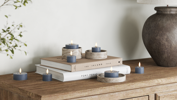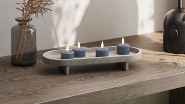For et rolig helhetsinntrykk kan du samle lysene på et fat og variere høydene, samtidig som du holder fargene i samme palett.